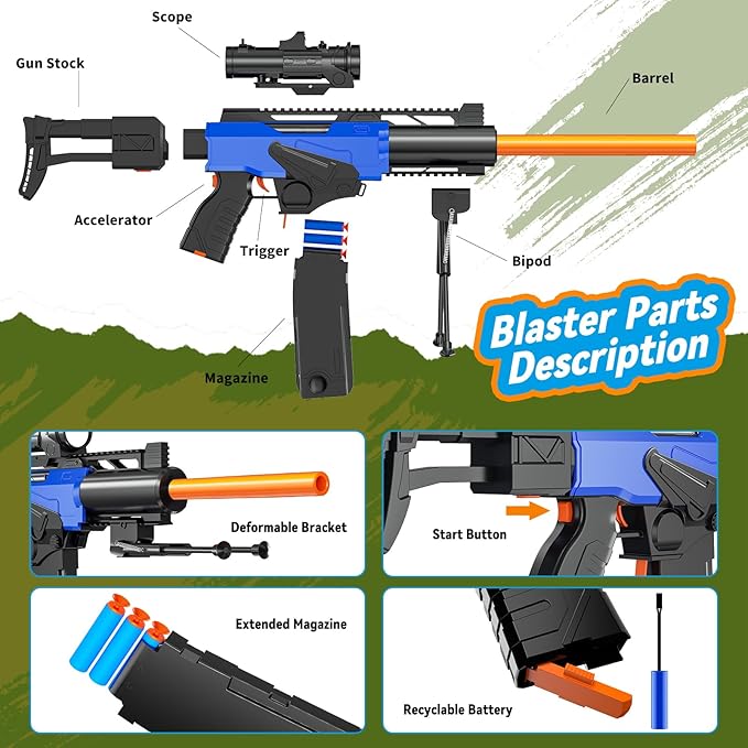 High-speed automatic blaster with 40,000+ gel balls & goggles. Rechargeable. Blue.